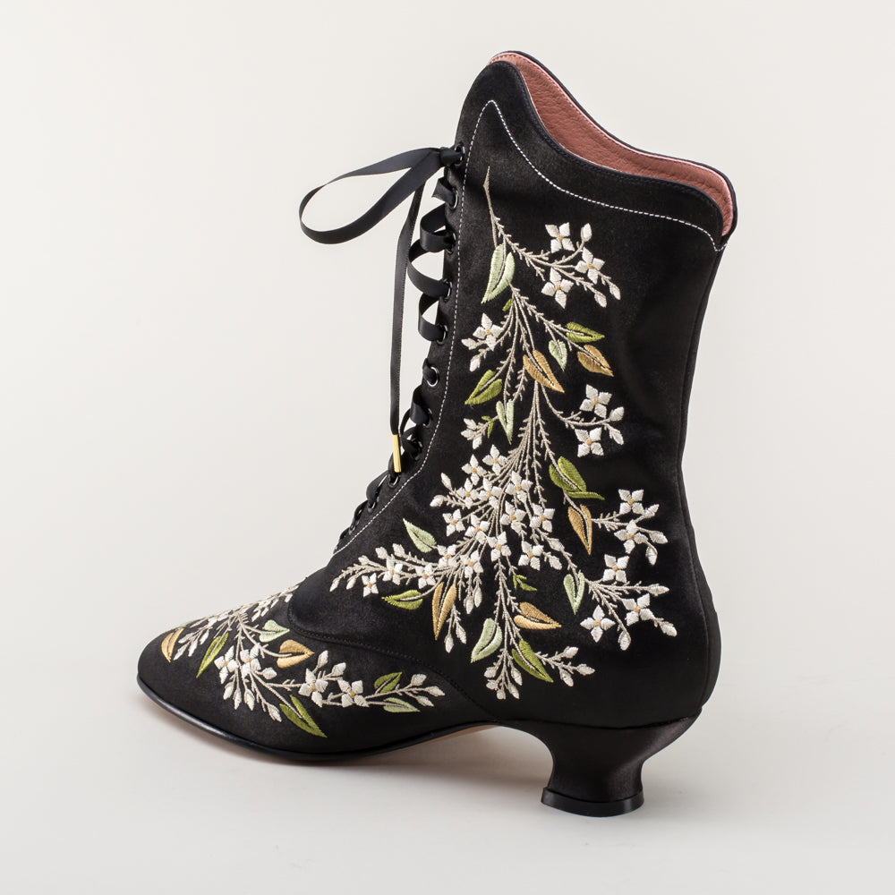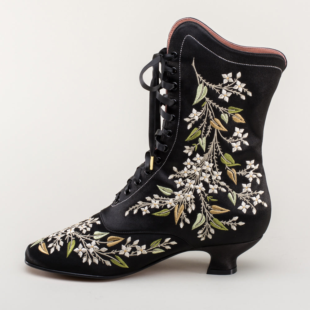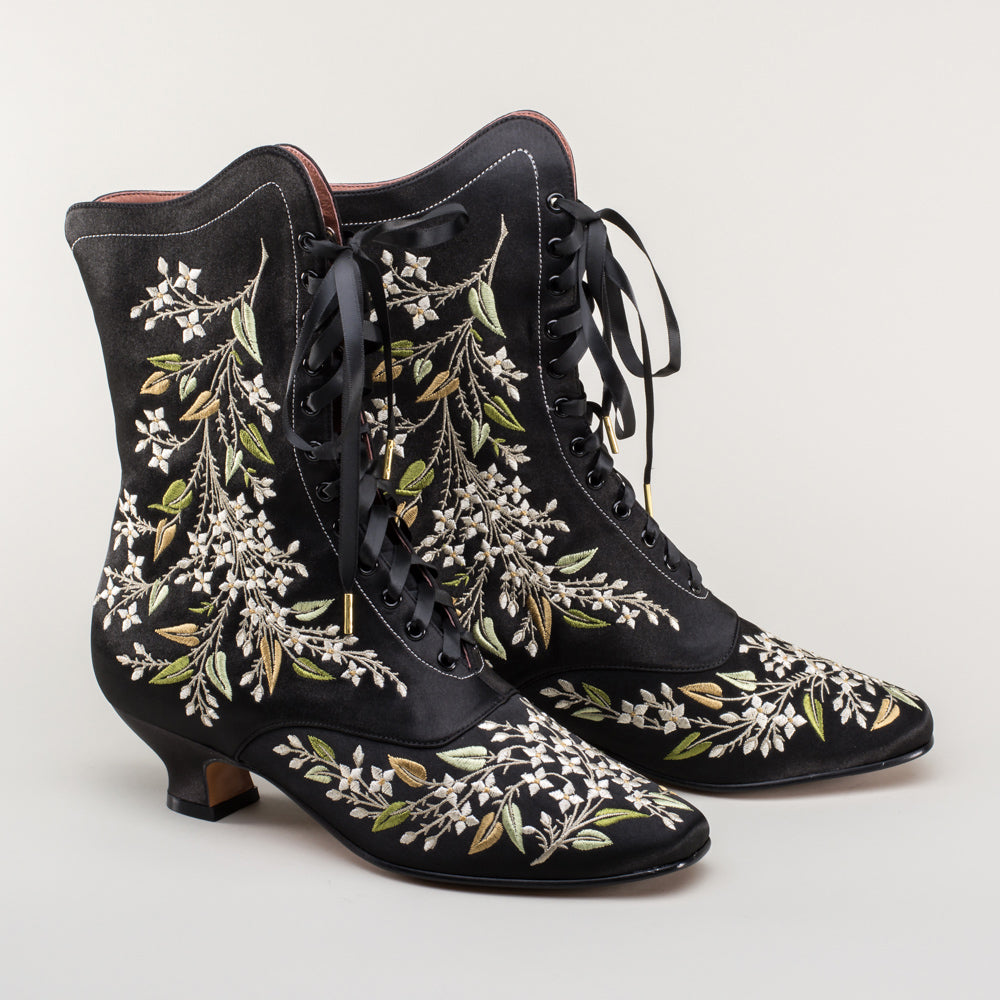 Indulge in a piece of history with Flora Embroidered Boots, an exclusive reproduction of the intricate opera and evening boots popular in the late Victorian period. Expertly crafted with intricate botanical detailing, these stunning satin boots will take you back to an era of sophistication and finesse. Wear them with bustle and Belle Epoque attire from the 1870s to c. 1900, or with modern dress as a statement piece.