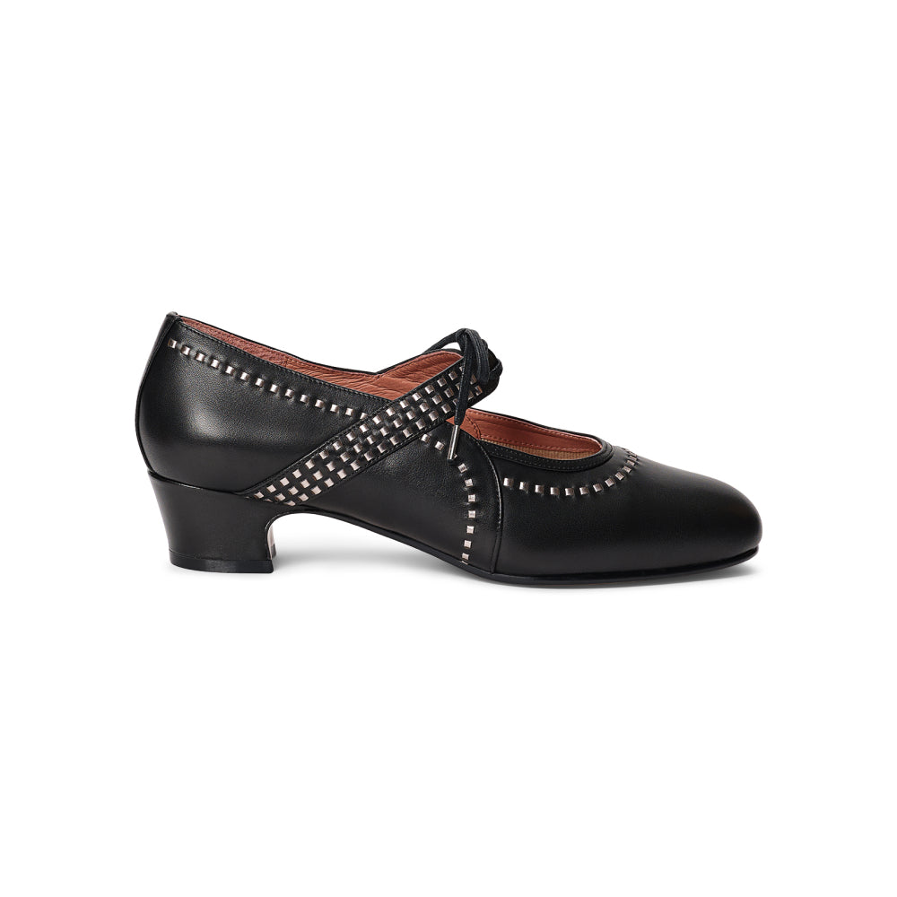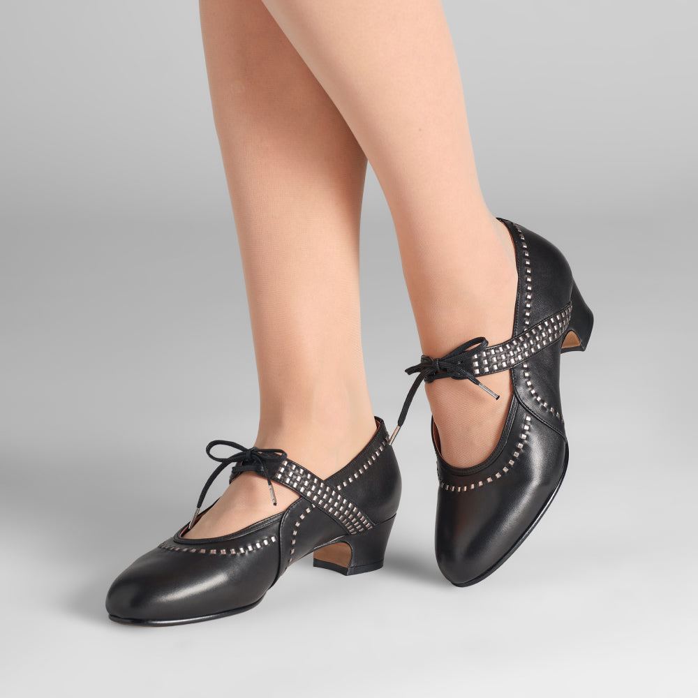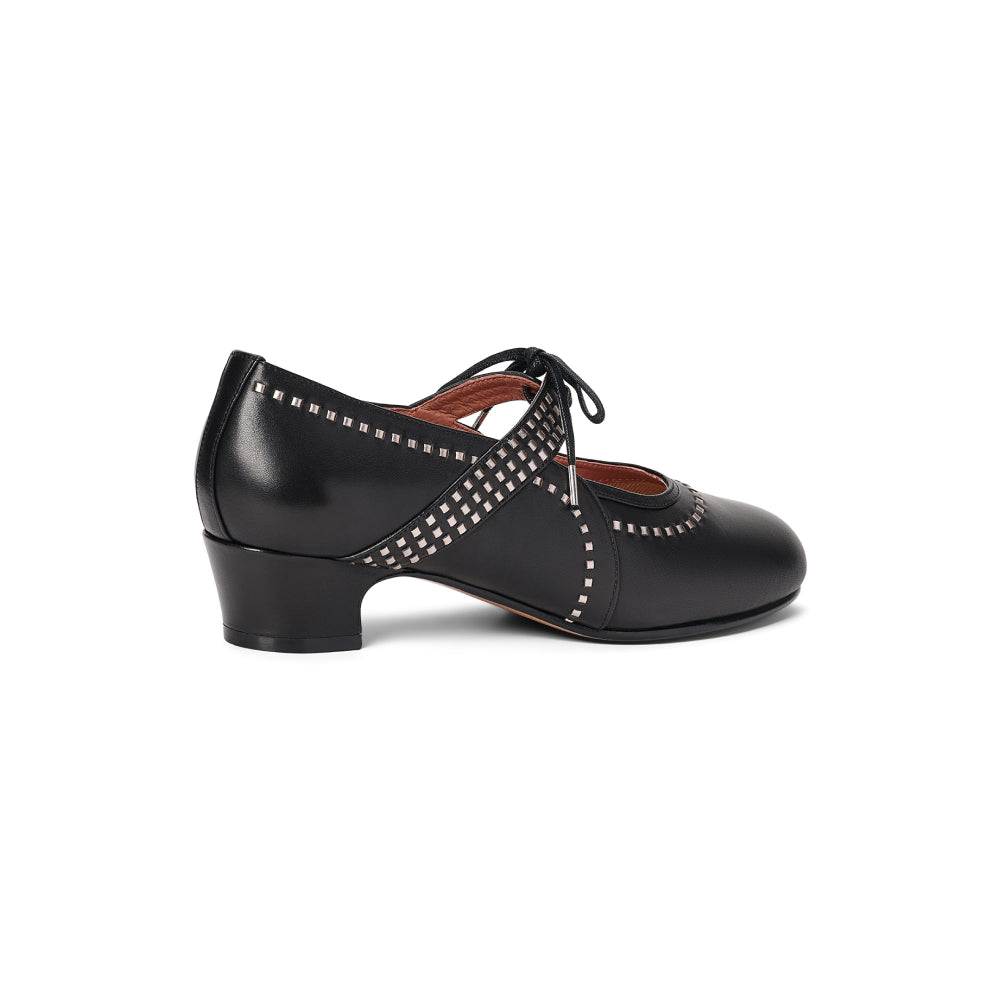 Meet Margaret, a do-it-all 1920s shoe with a unique twist. These round-toed, low-heeled beauties are built on a custom 1920s last, with a perfectly balanced 1.4"/3.6 cm heel. Margaret is decorated with intricate interwoven strips of smooth leather, which are complemented by the lace-up closure on the straps over the instep. Practical for daywear, but elegant enough for evening, Margaret is sure to turn heads wherever you go. Margaret is available in both standard and wide widths.