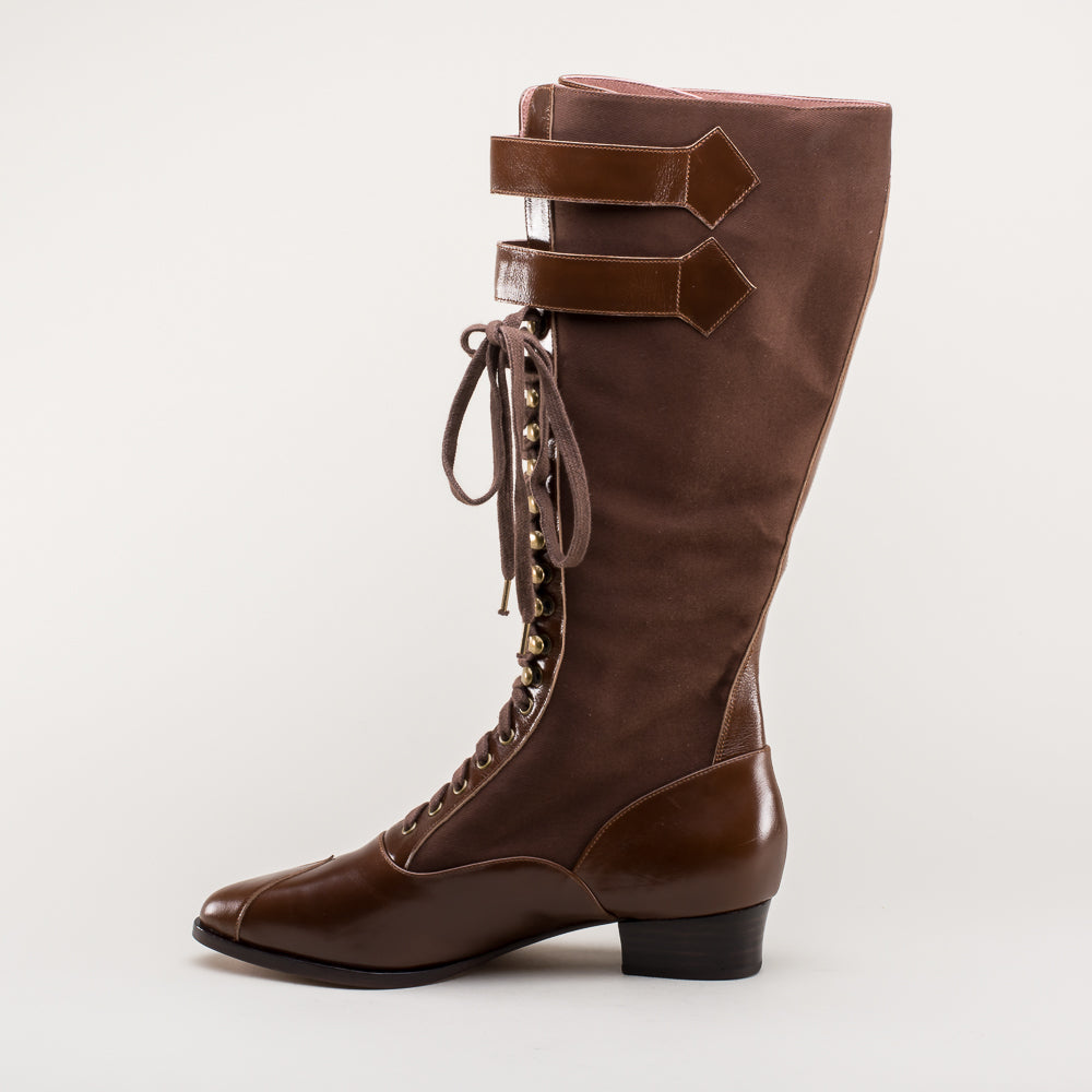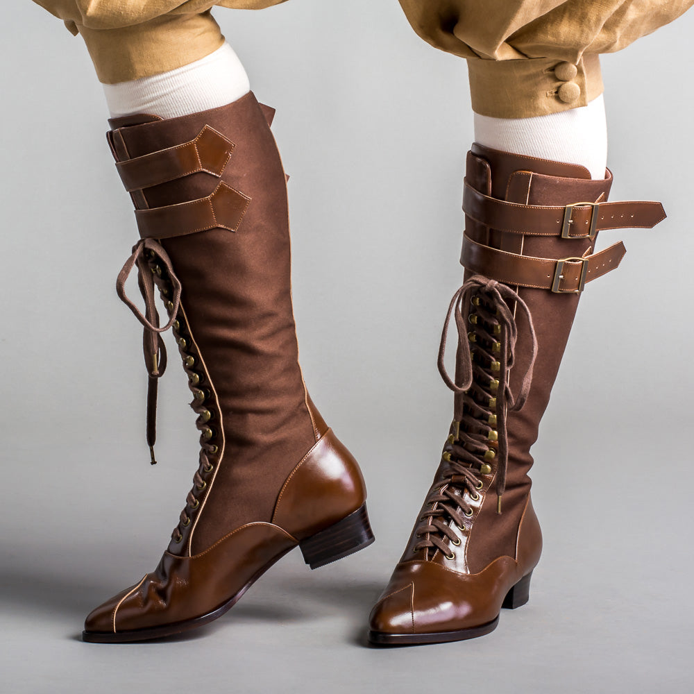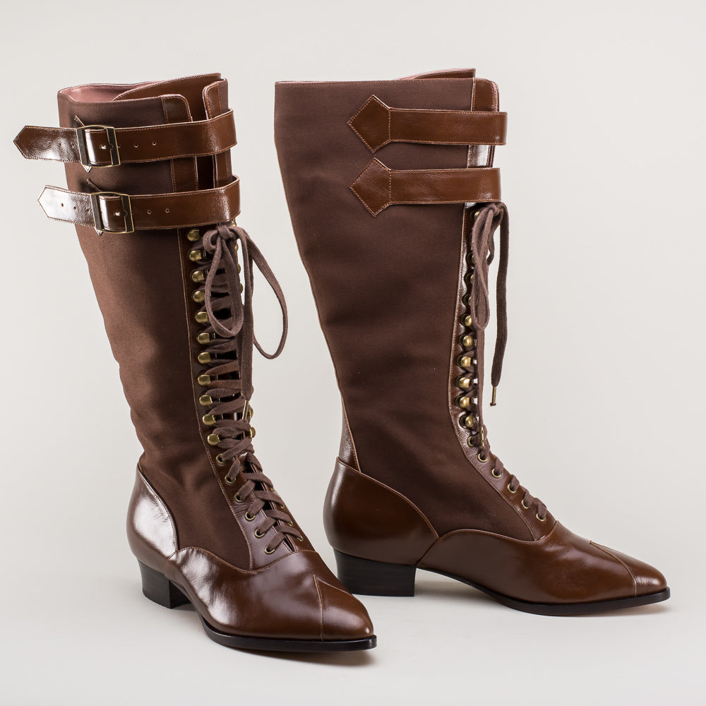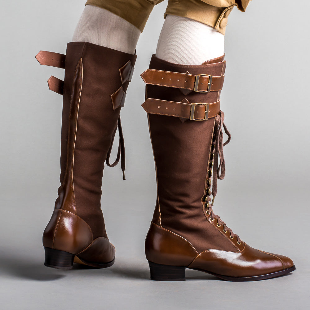 We must admit the Edwardians had serious style when it came to sporting attire. Our Cambridge Edwardian Bicycle Boots echo this past panache with glorious leather paired with flexible cotton twill canvas, quick-lacing, and double straps at the top. We've based the Cambridges on several pairs of original bicycle boots from the early 20th century, but updated for modern comfort, width, and durability. These boots aren't just for cycling, too. Wear them with bloomers, breeches, knickers, or skirts of any length for historical, vintage, historybounding, or modern attire.