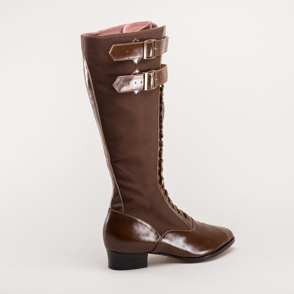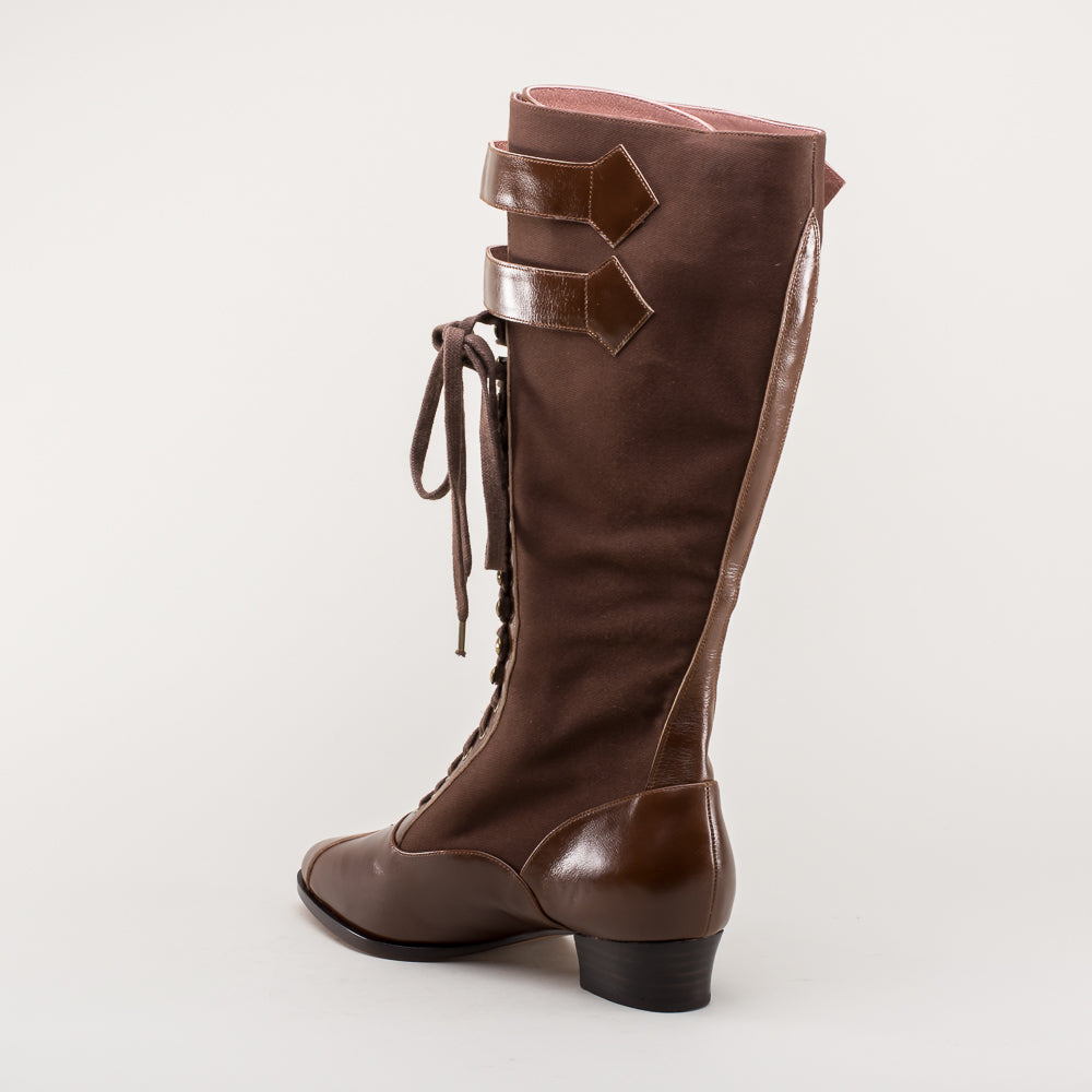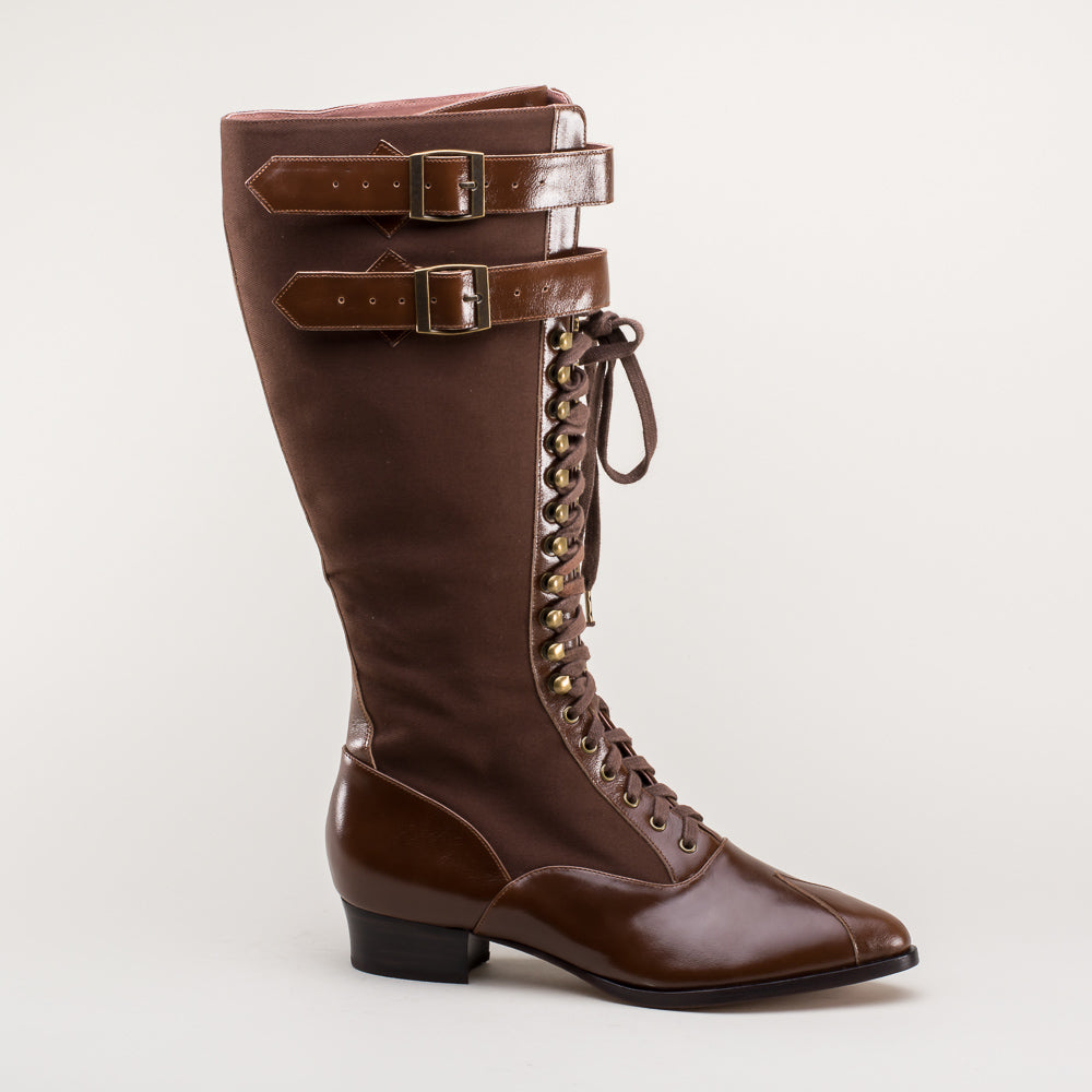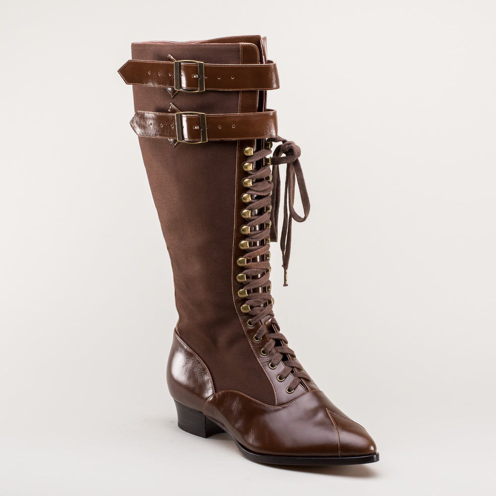 We must admit the Edwardians had serious style when it came to sporting attire. Our Cambridge Edwardian Bicycle Boots echo this past panache with glorious leather paired with flexible cotton twill canvas, quick-lacing, and double straps at the top. We've based the Cambridges on several pairs of original bicycle boots from the early 20th century, but updated for modern comfort, width, and durability. These boots aren't just for cycling, too. Wear them with bloomers, breeches, knickers, or skirts of any length for historical, vintage, historybounding, or modern attire.